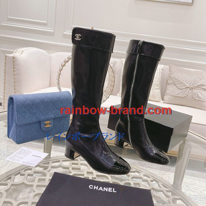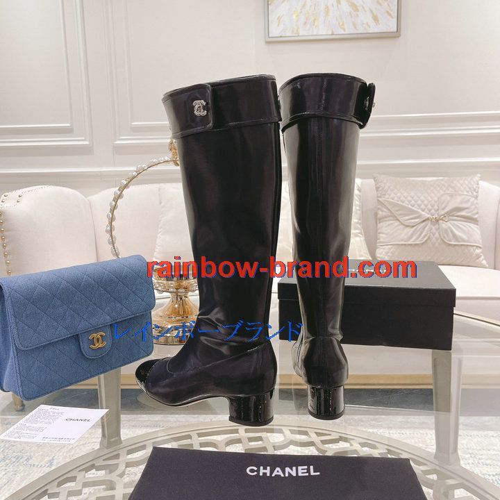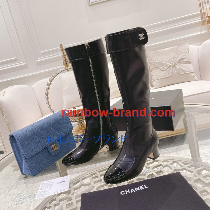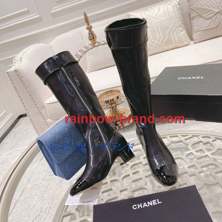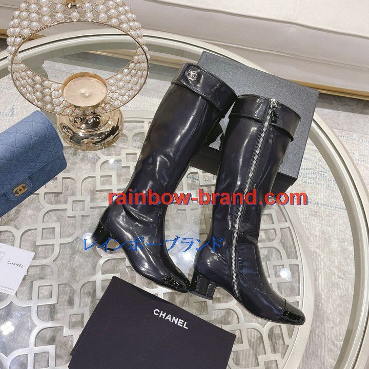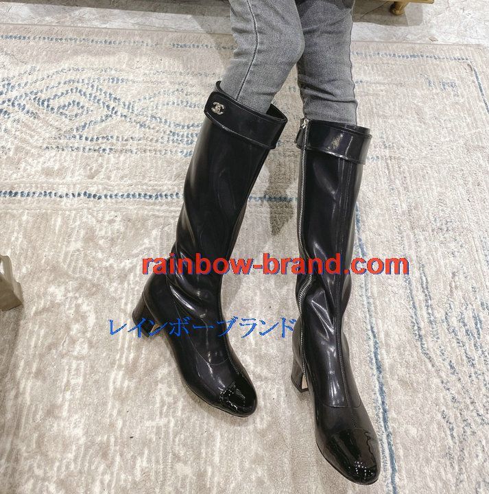 全商品を表示する:シャネル CHANEL 26-CHJ21075Q 2021年秋冬最新入荷 ロングブーツ ローヒールシューズ ファスナー開閉式 レディースシューズ カジュアルシューズ 靴 パテントレザー