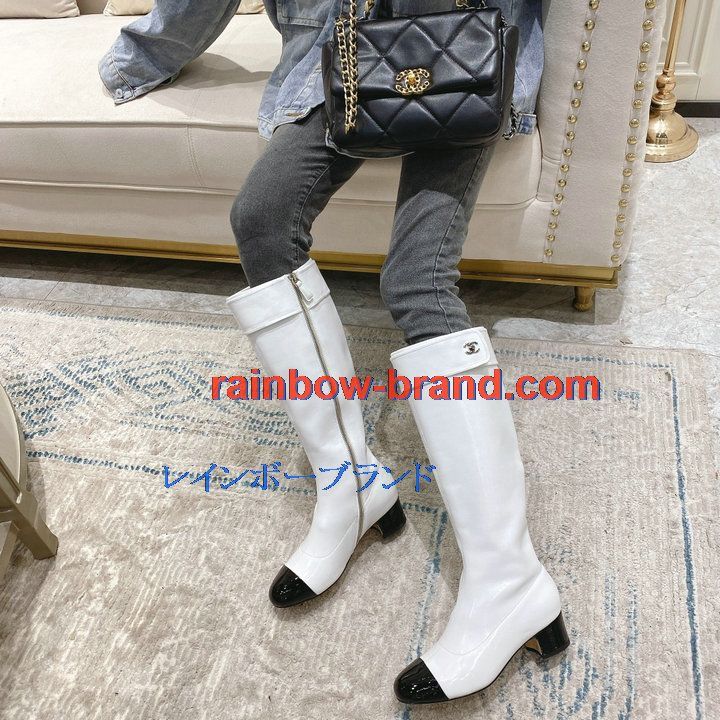 商品名称:シャネル CHANEL 26-CHJ21075Q 2021年秋冬最新入荷 ロングブーツ ローヒールシューズ ファスナー開閉式 レディースシューズ カジュアルシューズ 靴 パテントレザー